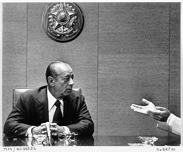 O Presidente Figueiredo, ao fundo o brasão presidencial e à direita, duas mãos, pedindo